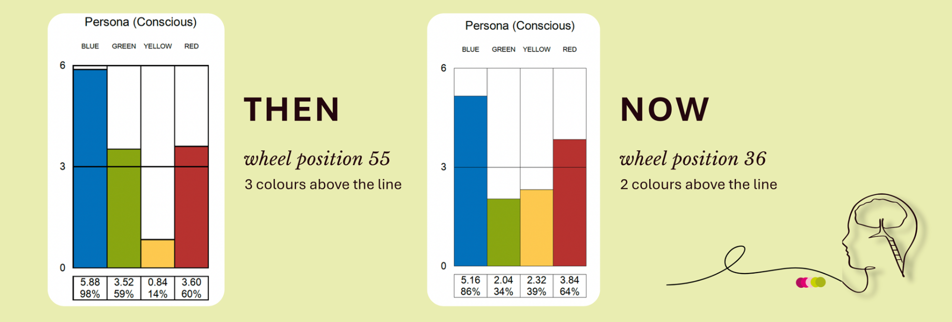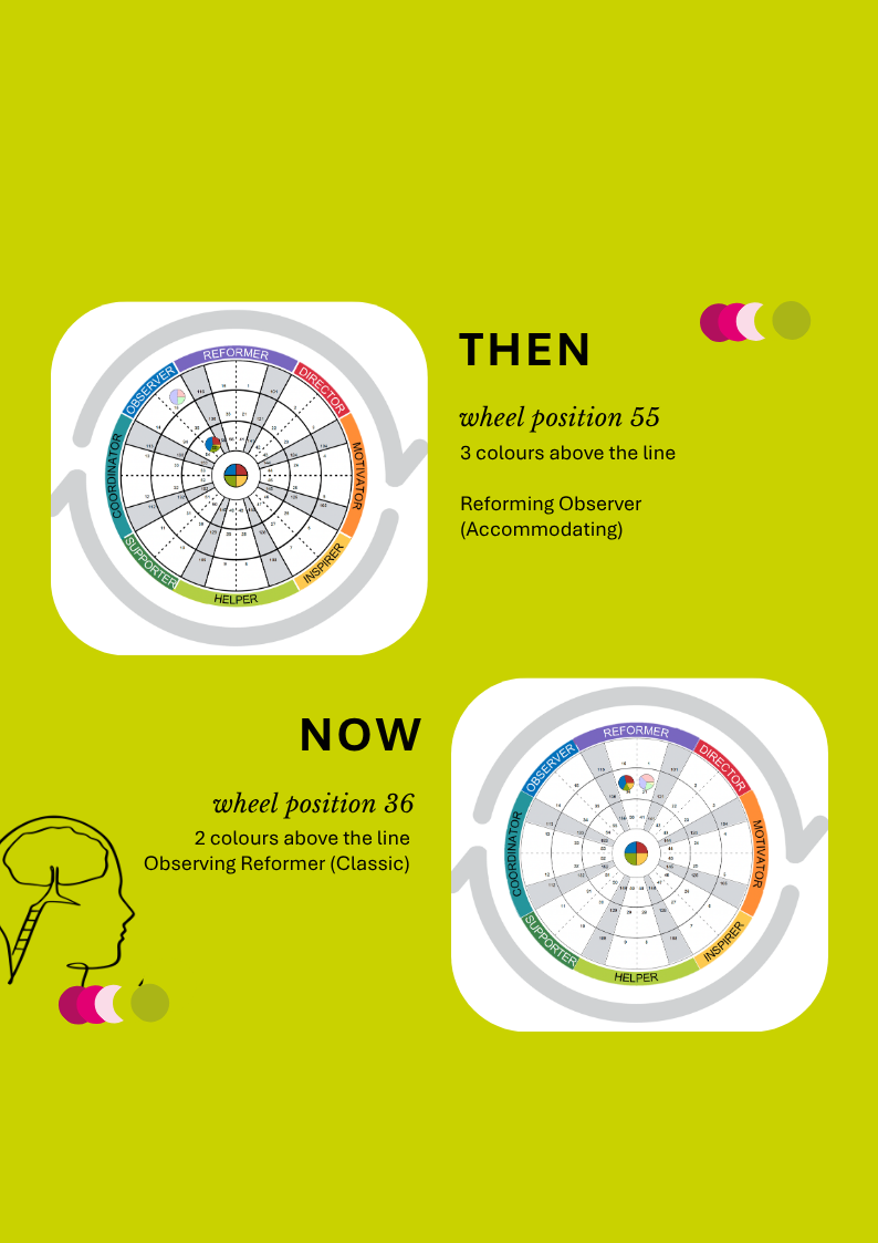 Relating this to Insights Discovery, for the last two years in employment, I have sat in wheel position 55. My strongest colour energies were Cool Blue, Fiery Red, and Earth Green, with very little Sunshine Yellow showing up.